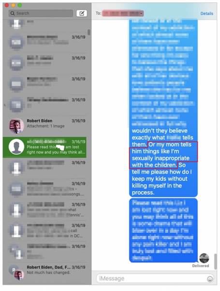 In another text message from Hunter to a family friend, Hunter shares that his mother, Jill Biden, propagates the claims that Hunter is sexually inappropriate around the children and VP Joe Biden is aware as well: