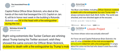 So The New York Times on January 8 published an emotionally gut-wrenching but complete fiction that never had any evidence — that Officer Sicknick’s skull was savagely bashed in with a fire extinguisher by a pro-Trump mob until he died — and, just like the now-discredited Russian bounty story also unveiled by that same paper, cable outlets and other media platforms repeated this lie over and over in the most emotionally manipulative way possible. Just watch a part of what they did and how: