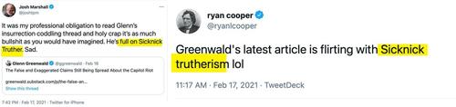 Because of its centrality to the media narrative and agenda, anyone who tried to point out the serious factual deficiencies in this story — in other words, people trying to be journalists — were smeared by Democratic Party loyalists who pretend to be journalists as “Sicknick Truthers,” white nationalist sympathizers, and supporters of insurrection.